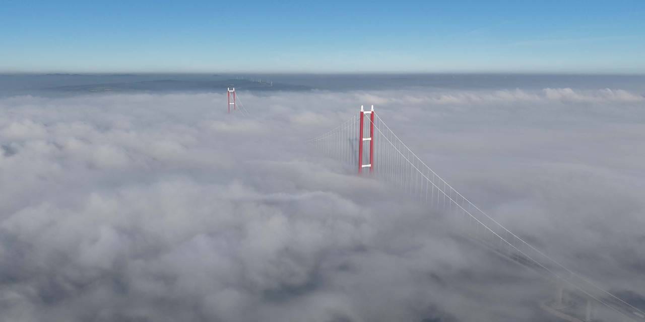 318 metre yüksekliğindeki köprü kuleleri ile dev ana halatların sis tabakasının üzerine çıktığı o anlar, yaklaşık 400 metre yükseklikten kayıt altına alındı.